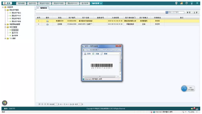 利用信息化技术及条形扫码设备等硬件设施实现条码管理、固定资产管理、固定资产信息提醒、固定资产物品查询、固定资产信息对比、固定资产报表导出与导入、系统管理、操作记录等功能,实现固定资产数据集成化、实物核查数据智能化功能、固定资产统计分析功能。