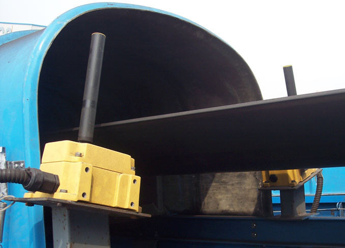 皮带跑偏时,皮带推动动作臂偏转,触动微动开关动作,发出报警信号。如果继续偏离到设定的停机位置,触动另一组触点,输送机就会保护性停机。