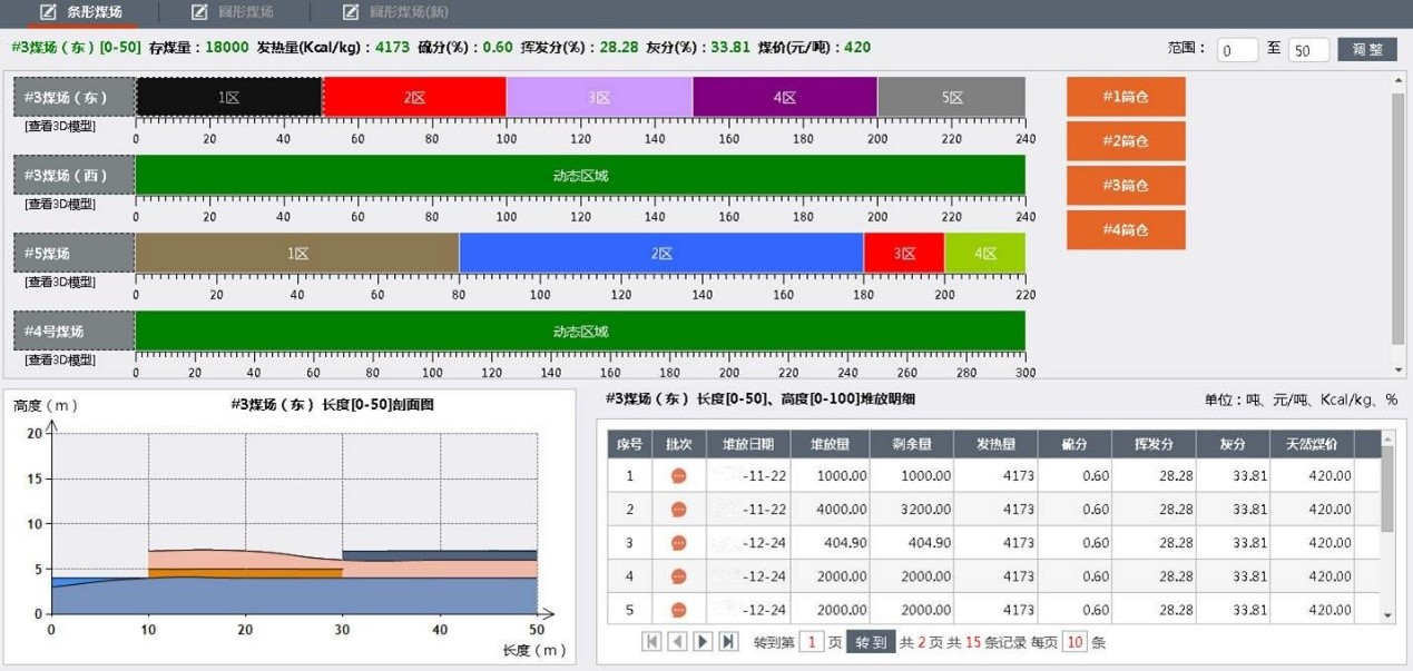 通过在煤场配置激光盘煤仪,再将进厂、堆取、入炉煤数据联动,以三维图形全面直观动态将煤场的信息和工作过程展示出来。准确直观显示煤场三维图、平面图和展开图、煤场表面和中部挡墙的实时温度分布图,以及煤场存煤信息。