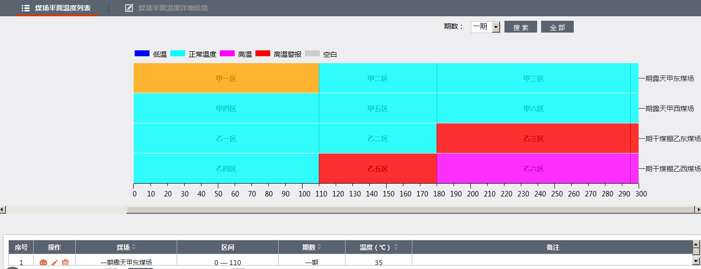 按照煤场温度的高低,将煤场的温度分为低温、正常温度、高温、高温预警,这四个温度段分别用四种不同的颜色显示,方便管理人员进行管理查看。
